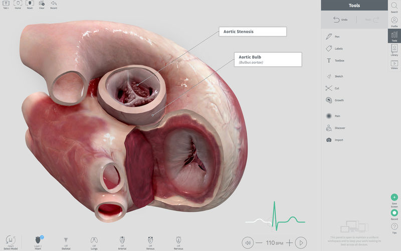 This app includes educational clinical tools including an interactive ECG, which can be controlled to see different stages of a heartbeat represented on the model. Additionally, by altering the BPM of the model in real time, the heart-rate can be set to simulate real scenarios, including arrhythmias such as tachycardia and bradycardia, all while continually interacting with the anatomy.