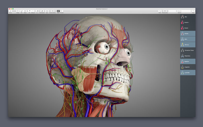 Essential Anatomy 5 is a full-featured anatomical reference app that includes MALE and FEMALE models, with 11 SYSTEMS and a total of 8,200 ANATOMICAL STRUCTURES. The app is fully 3D, meaning that you can view any structure in isolation, as well as from any angle. It represents the latest in groundbreaking 3D technology and innovative design. A cutting-edge 3D graphics engine, custom built by 3D4Medical, delivers outstanding quality graphics that no other competitor can achieve.